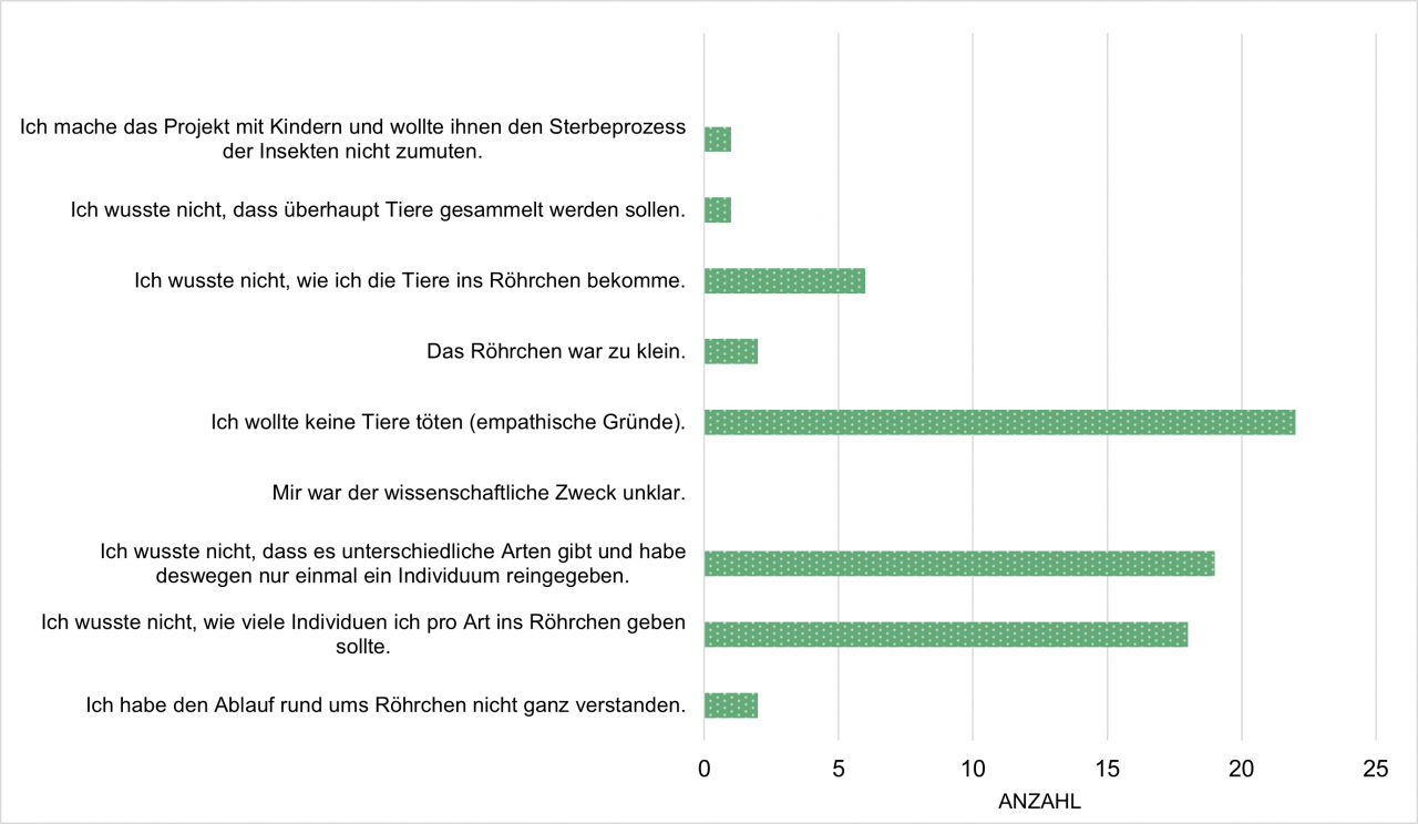 Insgesamt nannten 14% ethische Bedenken und 12% Unsicherheiten bei der Unterscheidung verschiedener Arten. Weitere 12% waren unsicher, wie viele Individuen pro Art ins Röhrchen gegeben werden sollten. Kleinere Gruppen berichteten über technische oder organisatorische Schwierigkeiten (Abb. 4).