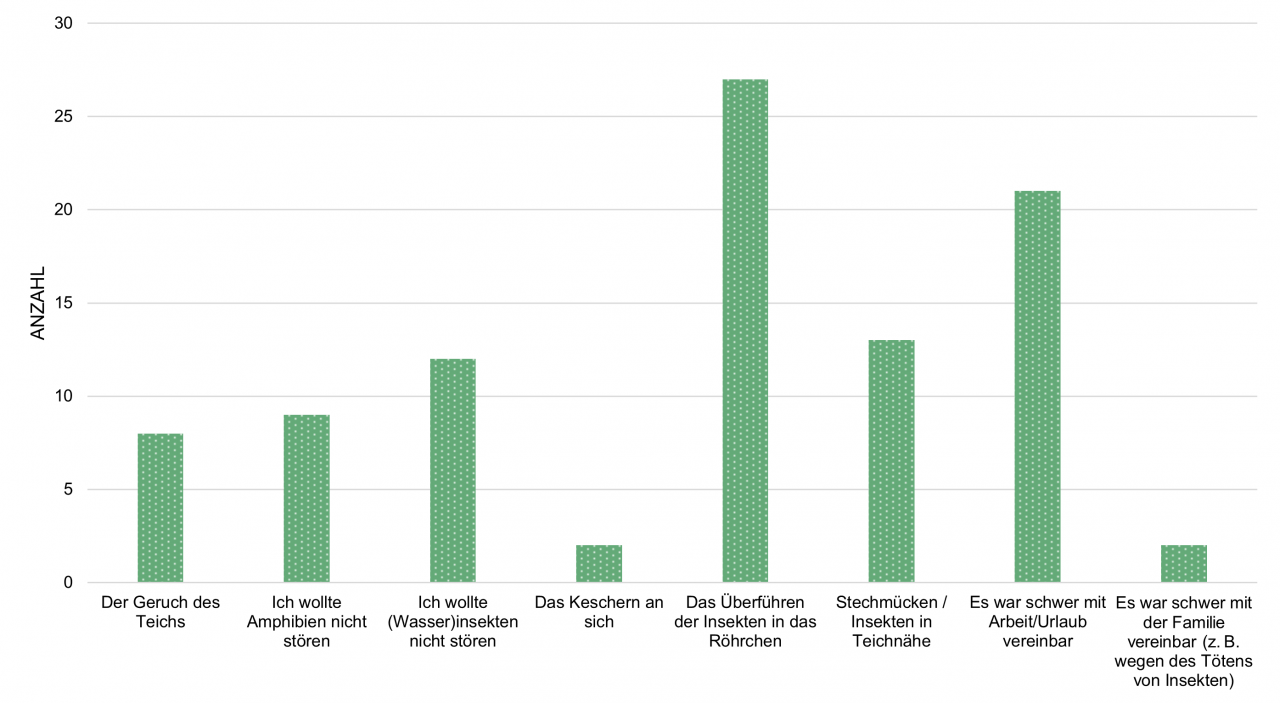 Am häufigsten genannt wurde das Überführen der Insekten ins Röhrchen (18%), gefolgt von zeitlichen Schwierigkeiten durch Arbeit oder Urlaub (14%) sowie Stechmücken und andere Insekten in Teichnähe (8%).