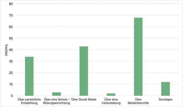 Die meisten Teilnehmenden erfuhren über Medienberichte (44%) vom Projekt AmphiBiom – ein deutlicher Hinweis darauf, dass das Projekt in der Anfangsphase stark in der Öffentlichkeit präsent war. 28% wurden über Social Media aufmerksam, während 22% durch persönliche Empfehlungen oder Hinweise von Freund*innen und Bekannten teilnahmen (Abb. 2).