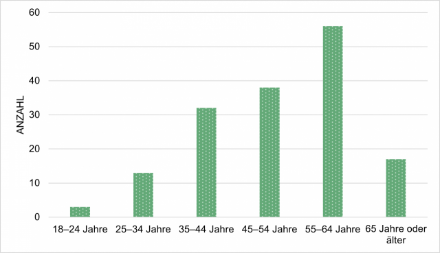 Etwa 8% der Befragten sind 25–34 Jahre alt, 11% gehören zur Gruppe 65 Jahre oder älter, und erstmals nahmen auch 2% junge Erwachsene zwischen 18 und 24 Jahren teil.