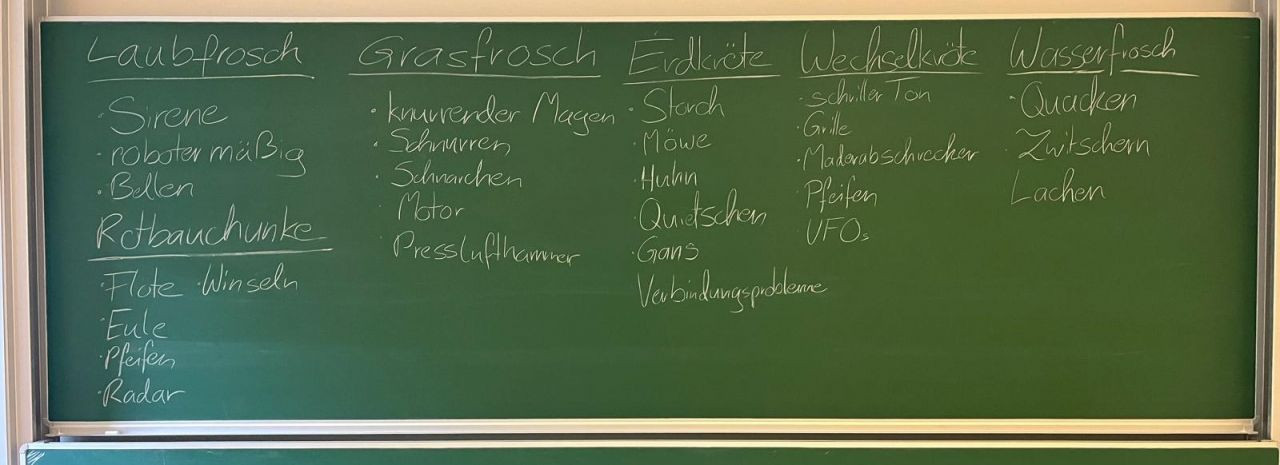 „Wie klingt das für euch?".  Zuvor hatten wir ihnen die Rufe einiger ausgewählter rufender Amphibien (Frösche, Kröten, Unken) Österreichs vorgespielt. Gemeinsam mit den Teilnehmer*innen unserer Workshops sammelten wir beim Young-Science-Kongress am 23. Oktober 2025 an der JKU Linz noch viele weitere kreative Assoziationen.